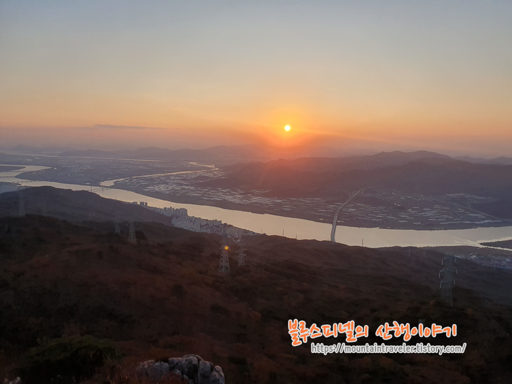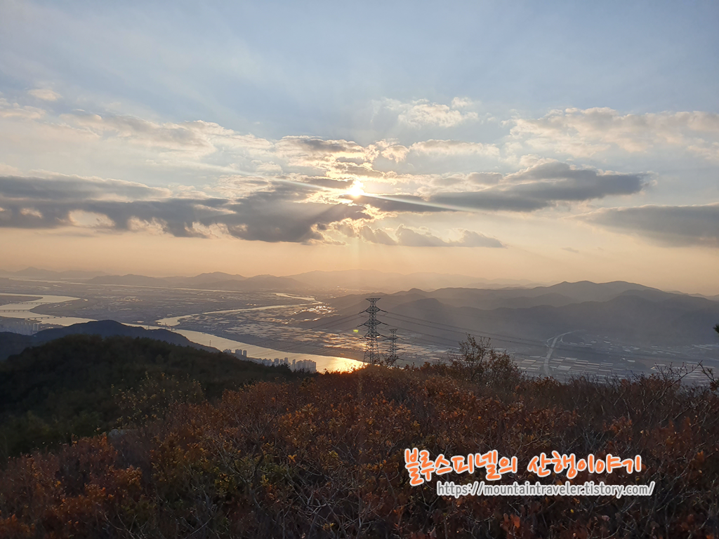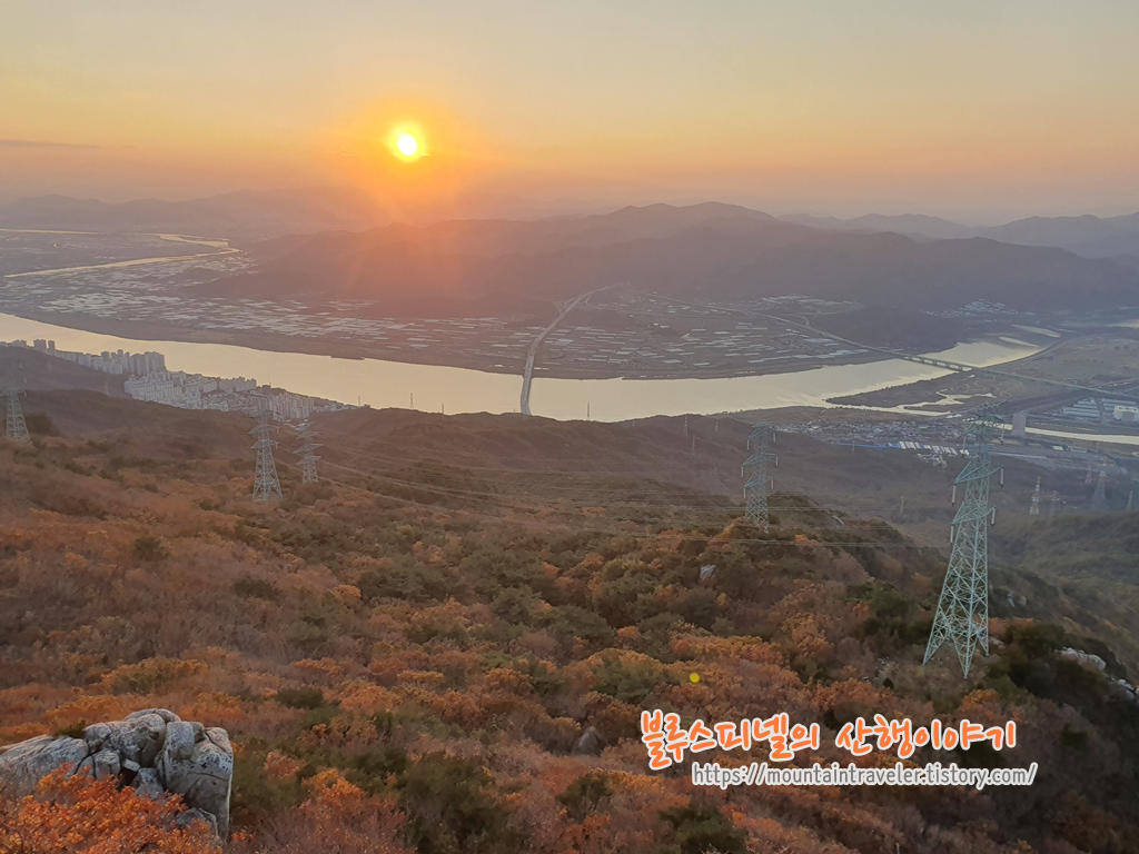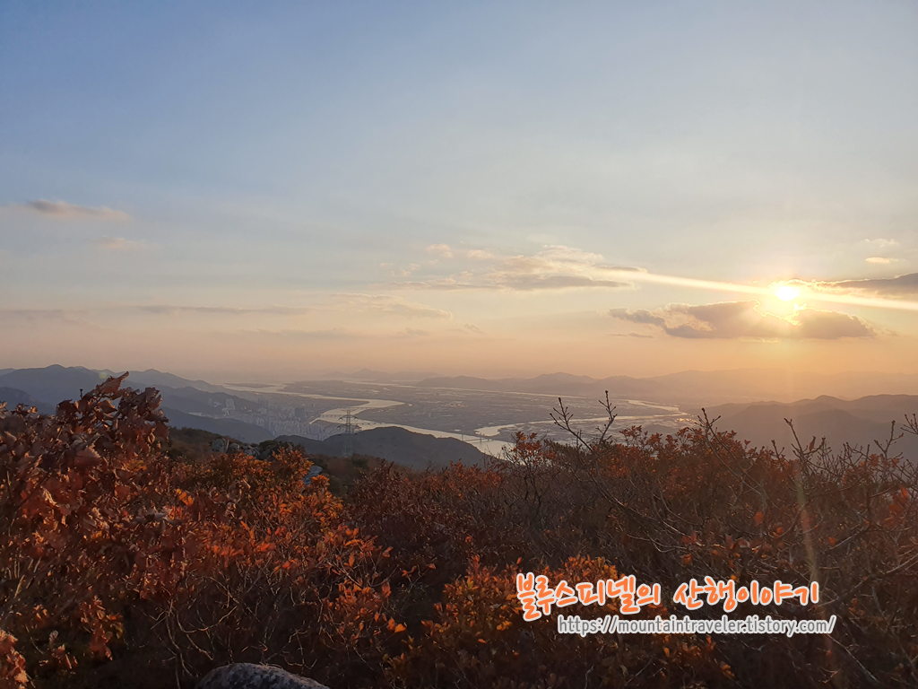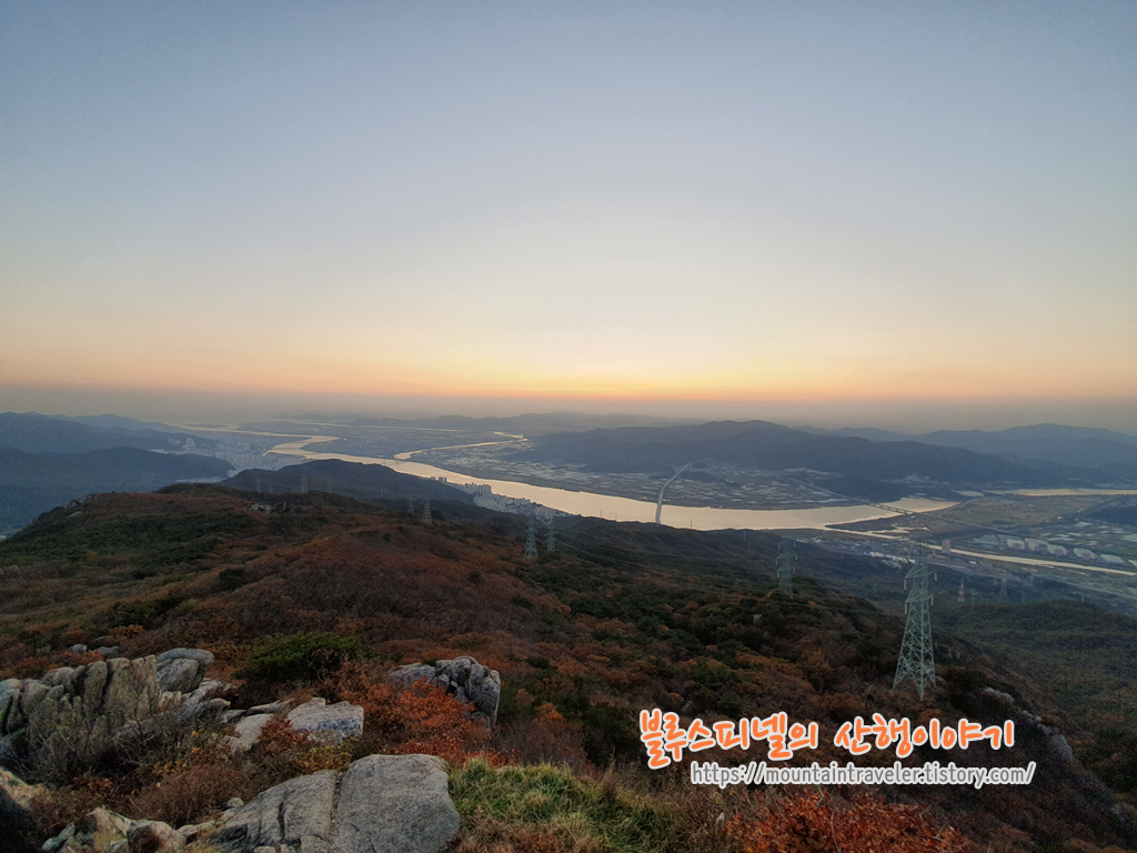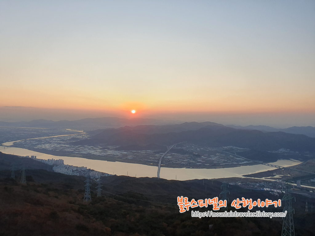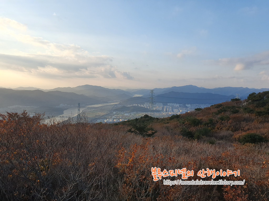 낙동강을 기준으로 좌측은 김해 무척산, 우측은 양산 토곡산입니다. 그 아래 물금신도시도 보이고요.