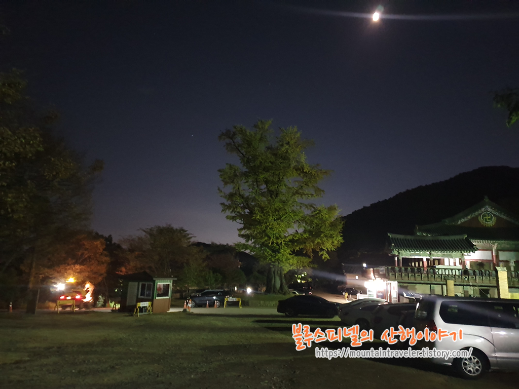 가로등이 켜진 주차장을 만나게 됩니다. 범어사 은행나무가 이 밤에도 너무 아름답습니다.