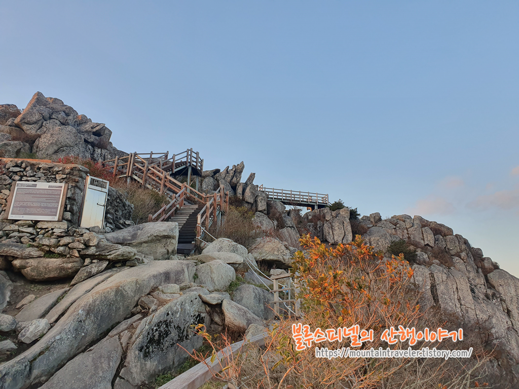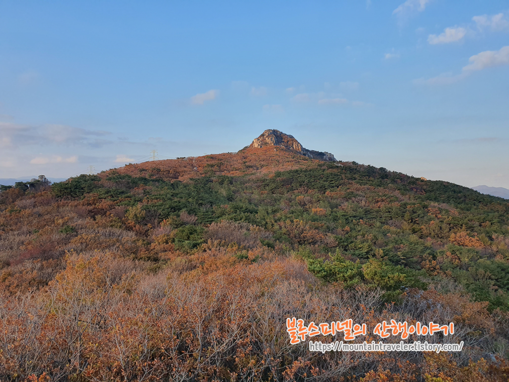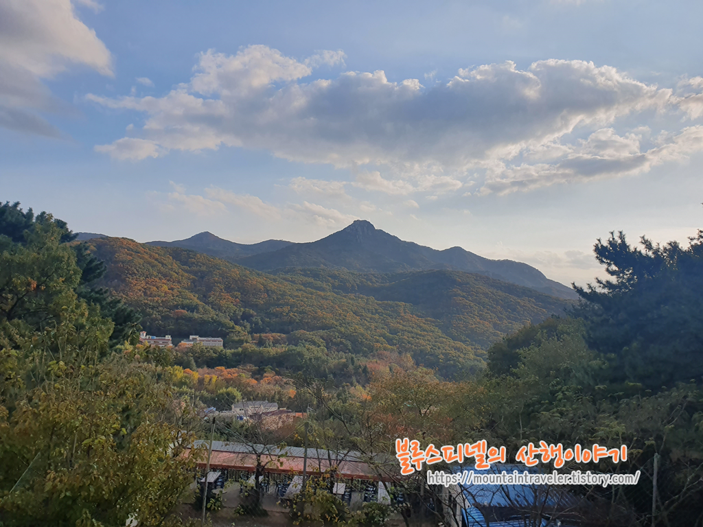 주봉인 고당봉보다 고도가 조금 낮은 미륵봉이 보입니다. 그 아래에는 미륵암이 위치하고 있고요. 트레킹에 가까운 부산 금정산 등산코스입니다.