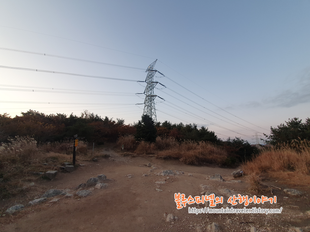 보이는 철탑 사거리로 내려갑니다. 3시 방면으로 하산을 하면 극락골을 지나 범어사 주차장을 만나게 됩니다.